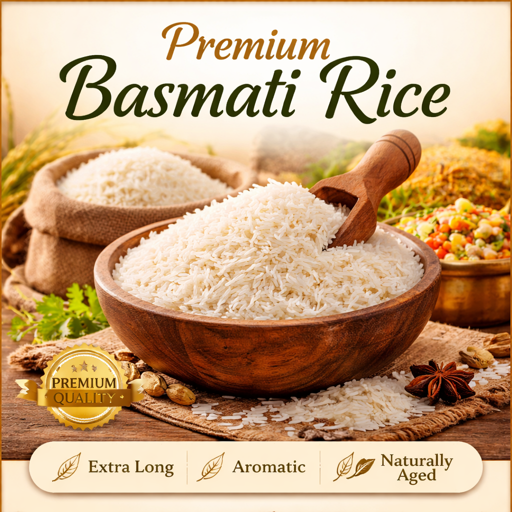 Premium Basmati Rice is known for its extra-long grains, rich aroma, and exceptional taste that enhances every meal. Sourced from the finest paddy fields and carefully aged to perfection, this rice offers a fluffy texture and non-sticky grains after cooking. Each grain elongates beautifully, making it ideal for biryani, pulao, fried rice, and other premium rice dishes.